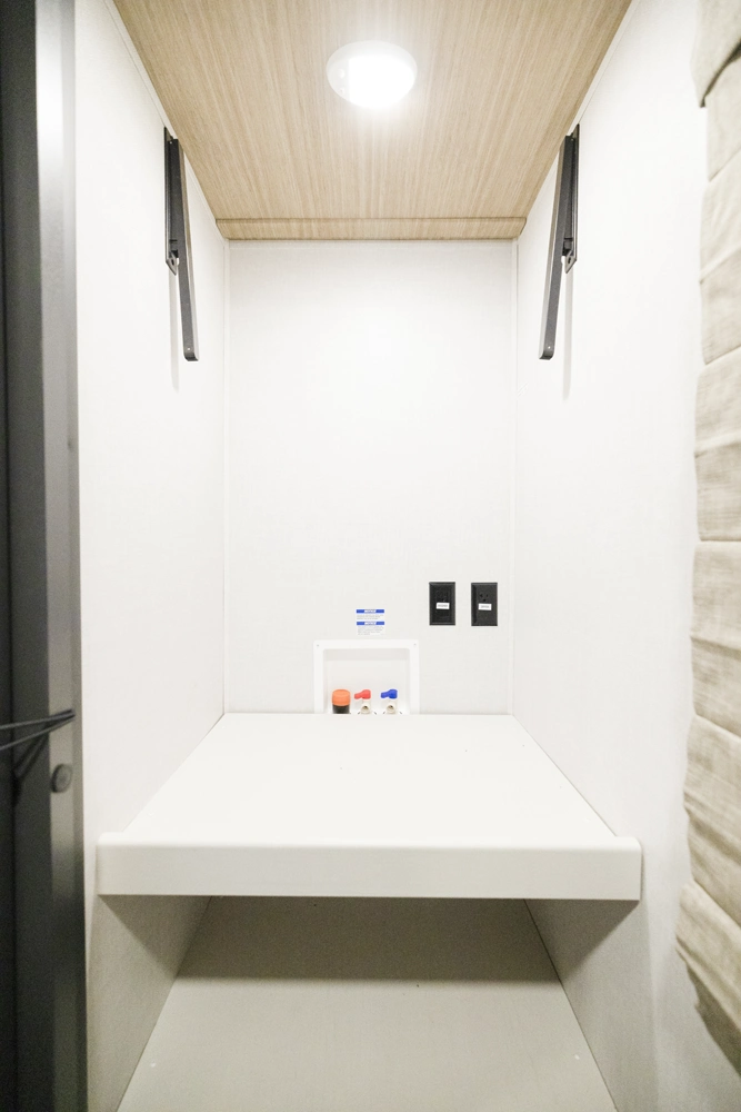 • Universal Docking Station Enclosed in Cargo Storage - Hookups Included: Cable & Satellite Switch, Fresh-Tank Gravity Fill, City Water, Black Tank Flush, Winterization Pump, Outdoor Shower, GFI Outlet, And Space Prepped for Solar Panel Controller