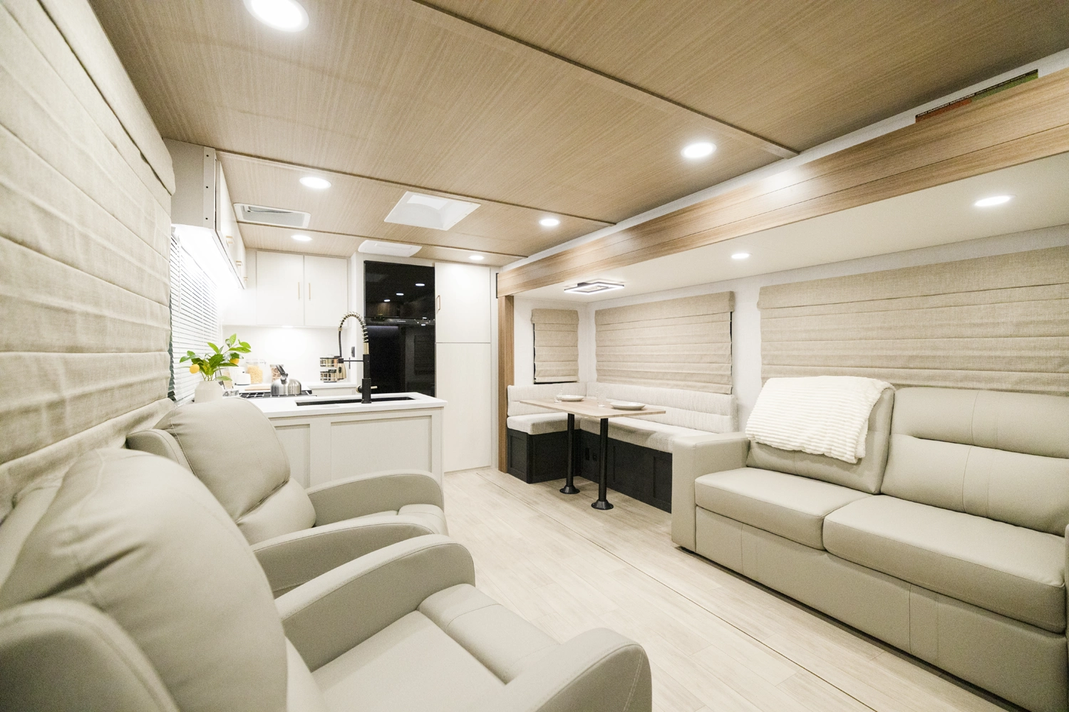 The 2600RK is a popular floorplan as we deliver a spacious rear kitchen with an ample amount of natural light and windows. This floorplan has a lot of energy focused on quality time with the family as the 2600RK comes complete with a 5-person dinette, tri-fold sofa (turns into bed), and two separate recliner chairs all within view of the kitchen. With a king bed and washer/dryer prep this lightweight coach offers more functional space than ever.
