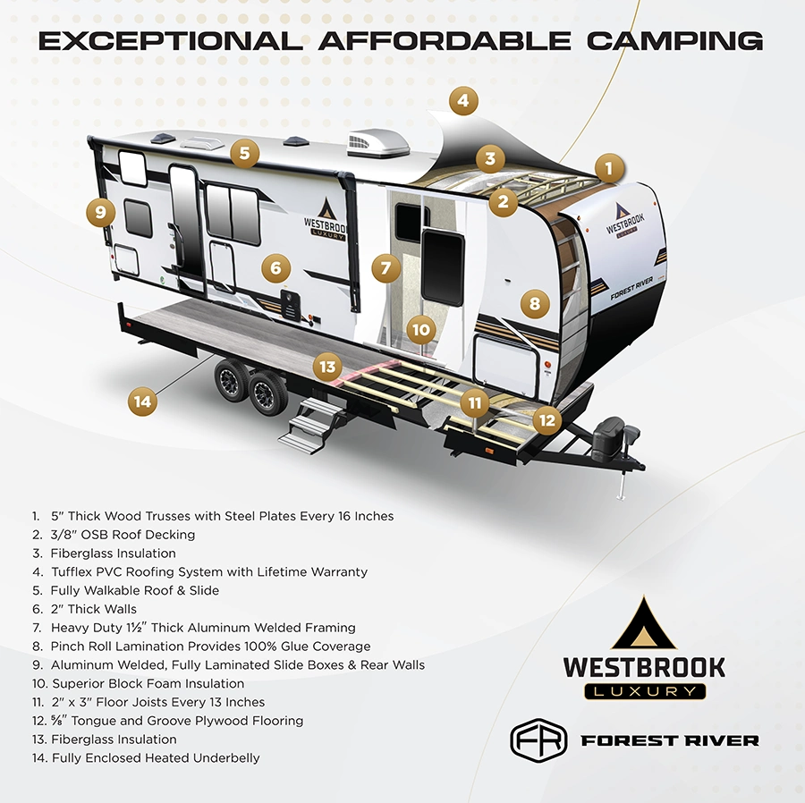 Elevate your adventures with the Westbrook Luxury line. Building upon the trusted foundation of the Westbrook name, our luxury collection offers an unparalleled travel experience for those with discerning tastes. Each Westbrook Luxury model is a testament to superior craftsmanship, boasting gourmet kitchens with premium appliances, and spacious master suites. From the moment you step inside, you’ll be surrounded by the high-end finishes and cutting-edge technology, all designed to provide an effortless and unforgettable journey.