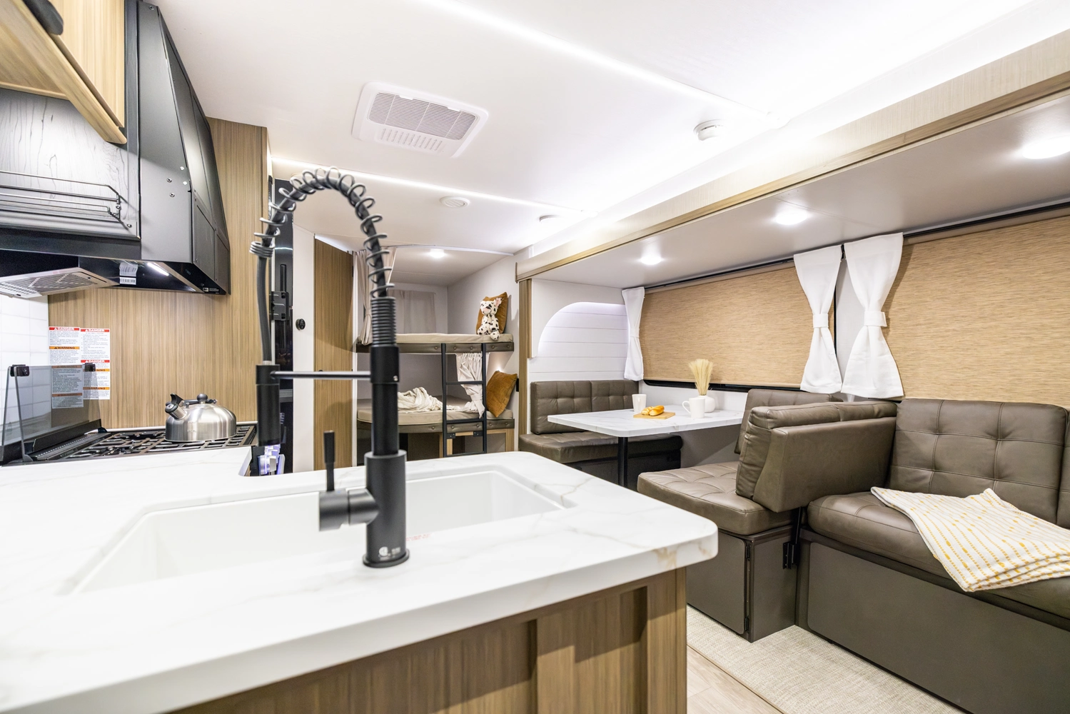 The 26DBUD is the perfect family travel trailer, with double bunks at one end and a queen bedroom at the other. You also get a fireplace (heater), full kitchen with glass-fronted cabinetry and large pantry, a U-dinette, and the customizable Versa-Lounge with Stow N Go Storage.