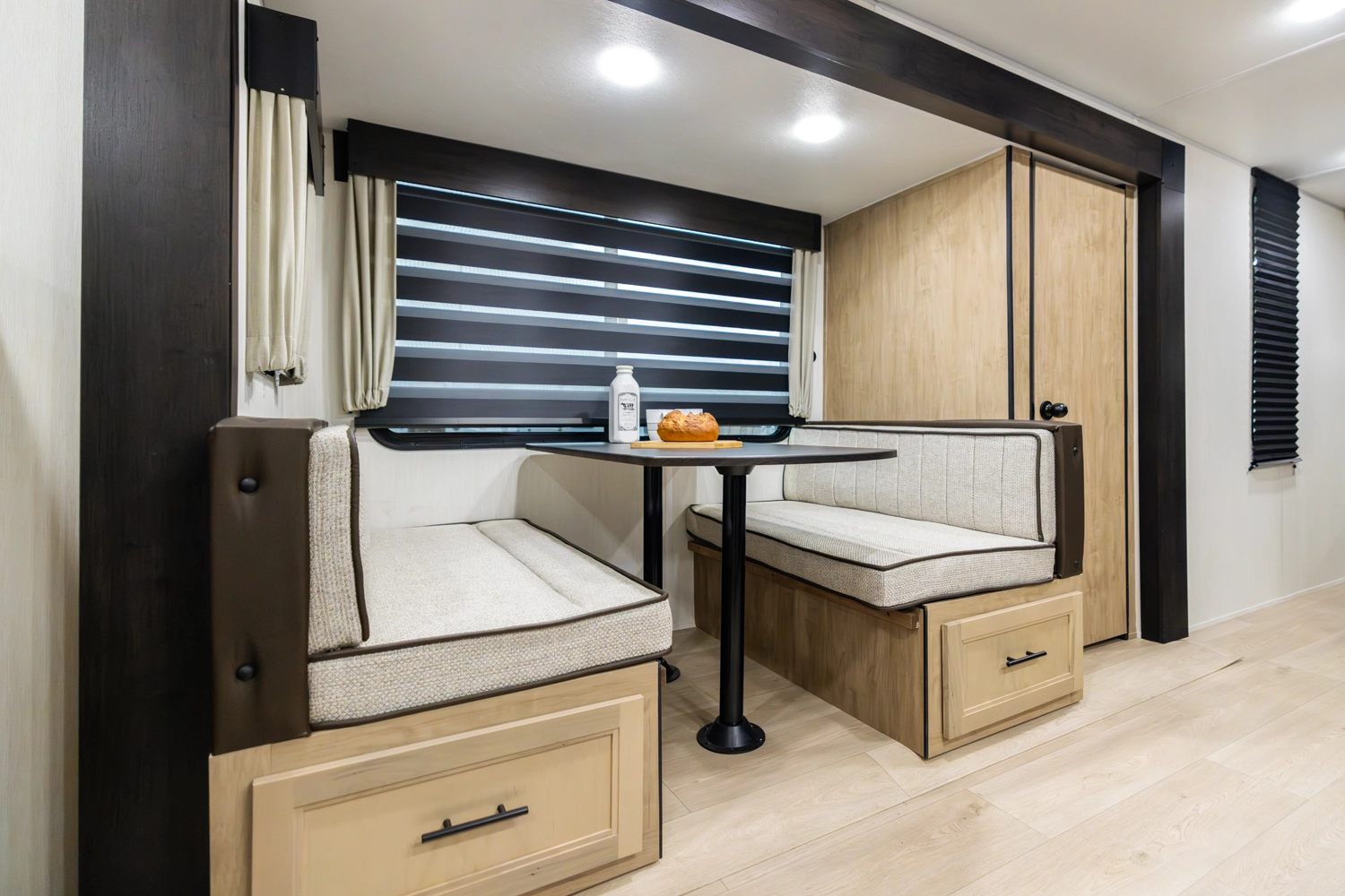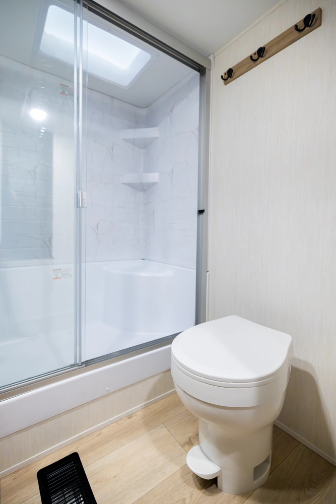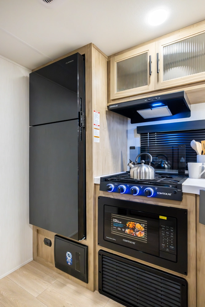 The triple slide is the perfect unit for affordable luxury and livability. The rear entertainment living room is surrounded by panoramic windows as well as two sofa slide and two recliners. The chef’s kitchen, kitchen bar with stools, and dinette slide with slide out drawers and full door pantry offer meet the needs of any chef. The private master suite completes the interior. Outside enjoy the camp kitchen, outside entertainment speakers, and TV bracket under our power awning.
